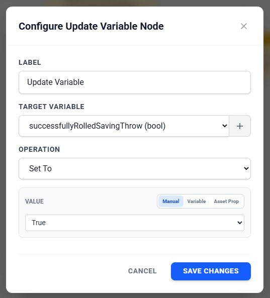 • Asset Property: Dynamically pull a value from a property on an asset (e.g., "Set Player.Gold to TreasureChest.GoldAmount").