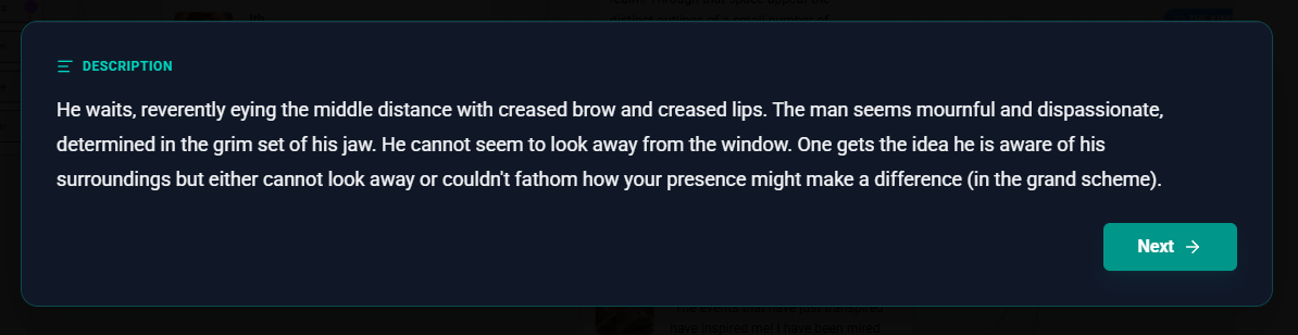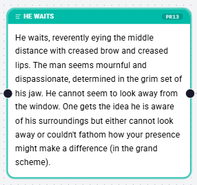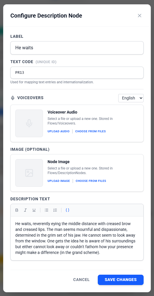 Description Nodes are the storytellers of your Flow. They are used to present narrative text, set the scene, or provide information to the player that doesn't come from a specific character's dialogue. Unlike Dialogue Nodes, which represent spoken word, Description Nodes represent the "voice of the narrator" or the internal thoughts of the player.